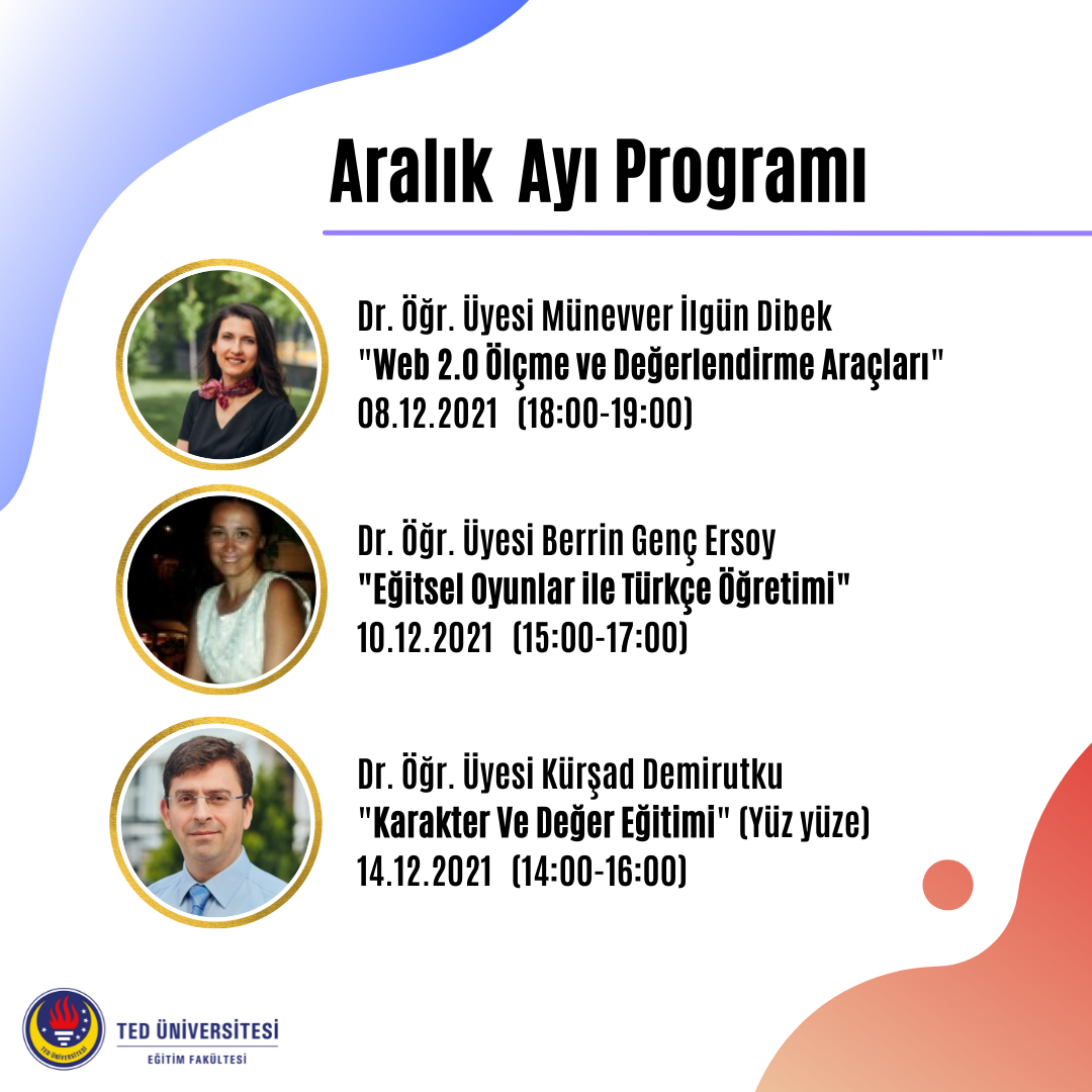 Dr. Öğr. Üyesi Münevver İlgün Dibek | Web 2.0 Ölçme ve Değerlendirme Araçları | Öğretmenler | 08.12.2021 | 18:00-19:00 | Çevrimiçi https://tedu.zoom.us/meeting/register/tJIocumqqjwjG9EXc0mblubeeYHIeHM-EiG8 |