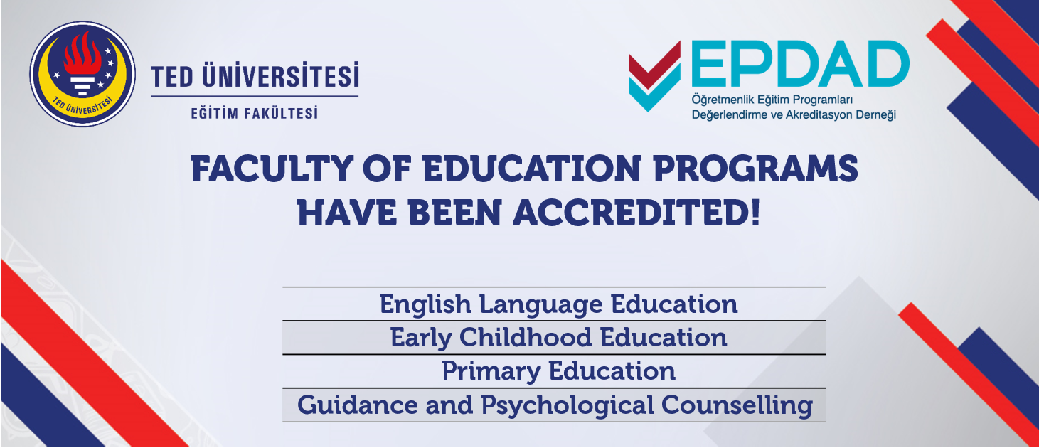 TED Üniversitesi Eğitim Fakültesi İngilizce Öğretmenliği Programı ilk kez 24.01.2021 tarihinden 24.04.2024 tarihine kadar EPDAD tarafından Akredite edilmiştir. 2019 yılında akredite edilmiş olan Okul Öncesi Öğretmenliği, Sınıf Öğretmenliği ve Rehberlik ve Psikolojik Danışmanlık Programlarının akredite süresi 28.03.2024 tarihine kadar uzatılmıştır. EPDAD'ın akredite edilen programlar listesine buraya tıklayarak erişebilirsiniz. Tüm hocalarımızı ve öğrencilerimizi kutlarız. Nice başarılara hep birlikte...