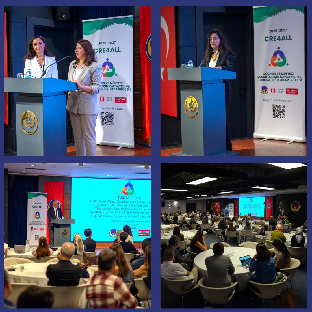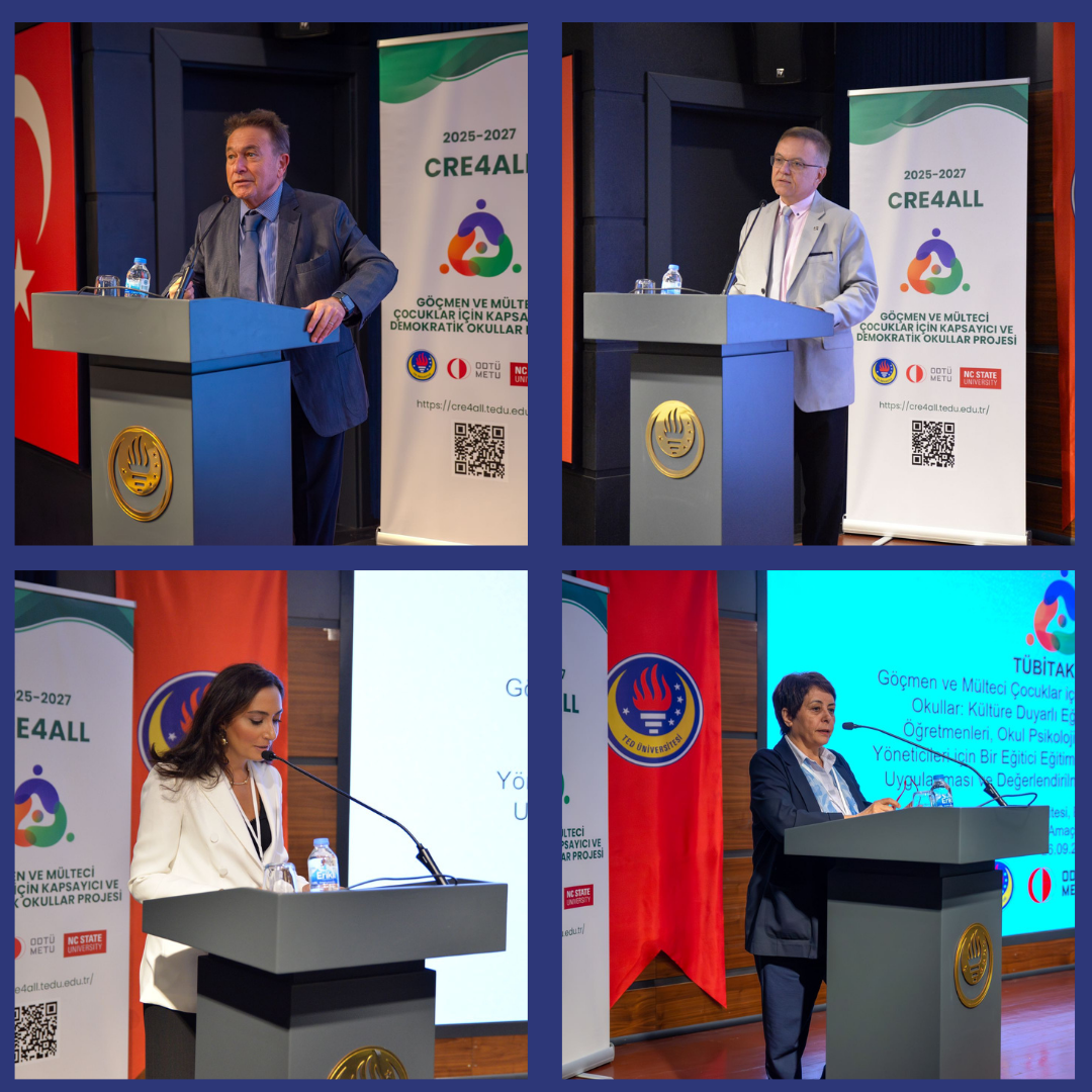 Eğitim Fakültemiz ev sahipliğinde ve Doç. Dr. Sibel Akın-Sabuncu’nun yürütücülüğünde, Orta Doğu Teknik Üniversitesi ve Amerika Birleşik Devletlerinden North Carolina Eyalet Üniversitesi iş birliğiyle gerçekleştirilen TÜBİTAK 3501 Kültüre Duyarlı Okullar Projesi (CRE4ALL: https://cre4all.tedu.edu.tr/) açılış toplantısı, Eğitim Fakültesi Dekanımız Prof. Dr. Kürşat Çağıltay, ODTÜ Eğitim Fakültesi Dekanı Prof. Dr. Mustafa Levent İnce, rektörümüz Prof. Dr. İhsan Sabuncuoğlu, Doç. Dr. Sibel Akın-Sabuncu ve ODTÜ Eğitim Fakültesi öğretim üyesi Prof. Dr. Cennet Engin’in açılış konuşmalarıyla başlayarak 26 Eylül 2025 Cuma tarihinde katılımcılarla birlikte düzenlenen çeşitli etkinliklerle gerçekleştirildi! Öğretim üyeleri, Ankara İl Millî Eğitim Müdürlüğü yetkilileri ve çeşitli davetlilerin de katılımlarıyla eğitim alanındaki birçok paydaşa ev sahipliği yaparak gerçekleşen proje açılış etkinliğinde, Ankara’nın 5 ilçesinden (Altındağ, Çankaya, Mamak, Keçiören, Yenimahalle) seçilen 30 ilkokulda görev yapan sınıf öğretmenleri, okul yöneticileri ve okul psikolojik danışmanları Kültüre Duyarlı Eğitim yaklaşımına dayalı bir eğitici eğitimi programına katılmak üzere bir araya geldi! Proje kapsamında katılımcıların desteklenmesi yoluyla kapsayıcı ve kültüre duyarlı eğitim ortamlarının geliştirilerek okulların güçlendirilmesi hedeflenmektedir.